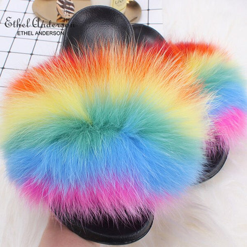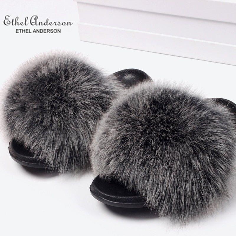 ETHEL ANDERSON 2020 Real Fox Raccoon Fur Slippers Slides Lady Retro Summer Newest Flip Flops Casual Fluffy Fur Sandals Shoes